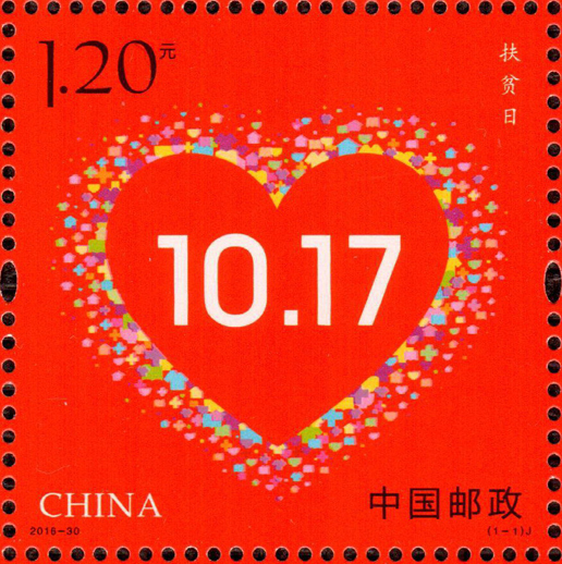 2016年10月17日是我國(guó)的第3個(gè)扶貧日,中國(guó)郵政發(fā)行《扶貧日》紀(jì)念郵票一套1枚。郵票設(shè)計(jì)以國(guó)旗紅為底色,將衣、食、住、醫(yī)、學(xué)等符號(hào)組合成心形——寓意兩不愁(不愁吃、不愁穿)、三保障(義務(wù)教育、基本醫(yī)療、住房),中間為扶貧日的日期10.17。整個(gè)設(shè)計(jì)寓意深刻,表達(dá)了全社會(huì)對(duì)扶貧工作的高度重視和積極參與。該套郵票由何潔、周岳設(shè)計(jì)。