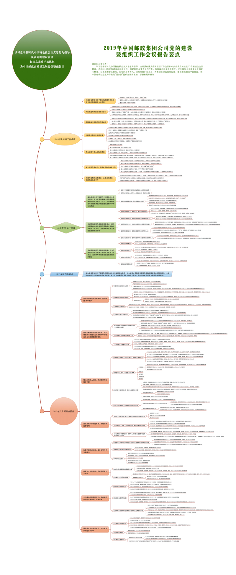 會(huì)議從七個(gè)方面總結(jié)了2018年郵政系統(tǒng)黨的建設(shè)和組織工作所取得的成績(jī):認(rèn)真學(xué)習(xí)貫徹習(xí)近平新時(shí)代中國特色社會(huì)主義思想和黨的十九大精神;突出把黨的政治建設(shè)擺在首位;巡視整改工作取得階段性成效;不斷強(qiáng)化基層黨組織建設(shè);著力加強(qiáng)干部人才隊(duì)伍建設(shè);深入推進(jìn)作風(fēng)建設(shè)、紀(jì)律建設(shè)和反腐敗工作;持續(xù)開展精神文明建設(shè)、企業(yè)文化建設(shè)、群團(tuán)和統(tǒng)戰(zhàn)等工作。