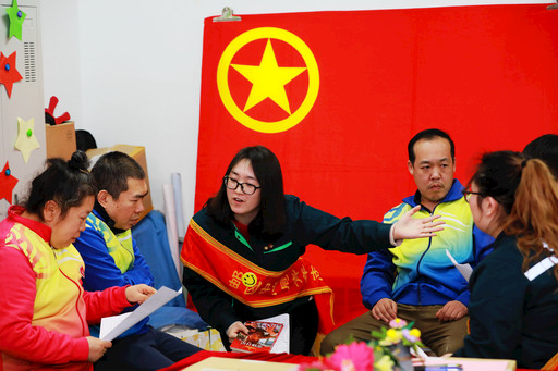 青年志愿者和殘疾人朋友一起閱讀《雷鋒日記》,編排《年輕純潔的心》。