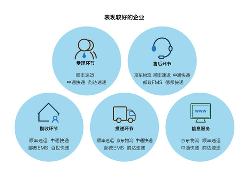 4月24日,國家郵政局發(fā)布了關(guān)于2019年第一季度快遞服務(wù)滿意度調(diào)查和時限準時率測試結(jié)果的通告,在快遞企業(yè)公眾滿意度方面,得分在80分以上的企業(yè)為順豐速運、京東物流,得分在76-80分之間的企業(yè)為郵政EMS、中通快遞、韻達速遞、申通快遞、圓通速遞和百世快遞。(見圖表3)在此之前,國家郵政局發(fā)布2018年快遞服務(wù)用戶滿意度、時限準時率調(diào)查結(jié)果??爝f企業(yè)總體滿意度排名依次為:順豐速運、郵政EMS、京東物流、中通快遞、韻達速遞、圓通速遞、百世快遞、申通快遞、德邦快遞、優(yōu)速快遞。在受理環(huán)節(jié)表現(xiàn)較好的企業(yè)有:順豐速運、中通快遞和韻達速遞;在攬收環(huán)節(jié)表現(xiàn)較好的企業(yè)有:順豐速運、中通快遞、郵政EMS、百世快遞;投遞環(huán)節(jié)表現(xiàn)較好的企業(yè)有:順豐速運、京東物流、中通快遞、郵政EMS、韻達速遞;售后環(huán)節(jié)表現(xiàn)較好的企業(yè)有:京東物流、順豐速運、中通快遞、郵政EMS和德邦快遞。信息服務(wù)方面表現(xiàn)較好的企業(yè)有:京東物流、順豐速運、中通快遞、韻達速遞。(見圖表4)