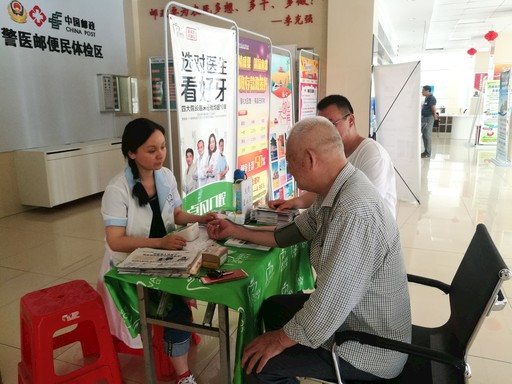 武漢市黃陂區(qū)雙鳳郵政營業(yè)所與口腔醫(yī)院開展異業(yè)合作。醫(yī)生在代發(fā)養(yǎng)老金的高峰期為客戶免費測量血壓,并贈送客戶洗牙、拔牙優(yōu)惠券。左春卉 攝