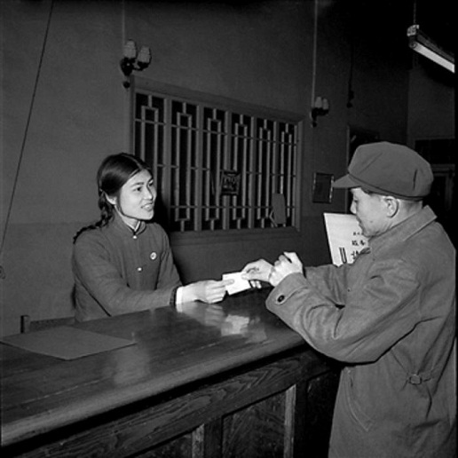 1958年4月,北京東四郵電局,營業(yè)員廉旻(圖左)主動向顧客介紹業(yè)務(wù)。當(dāng)年,東四郵電局涌現(xiàn)出了常秀珍、沈秀敏、章秀敏、喬秀蘭和廉旻優(yōu)秀服務(wù)群體,人稱“四秀一廉”。 工人日報 杜治 攝