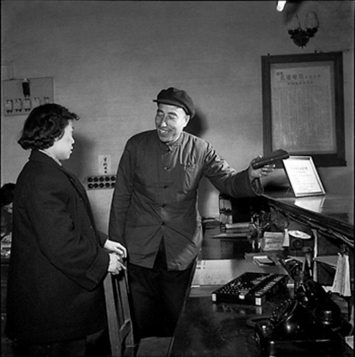 1958年4月,北京東四郵電局,在郵局工作了30多年的于鴻澤(圖右)積極為顧客填寫單據(jù)。工人日報 杜治 攝