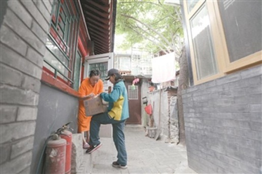 6月4日上午10時,天降小雨,劉小梅已經(jīng)開始當(dāng)天的第二趟投遞。在一胡同口,劉小梅和認識的當(dāng)?shù)刈舸蛘泻簟?br />