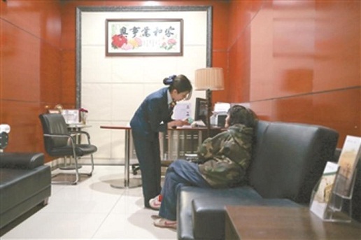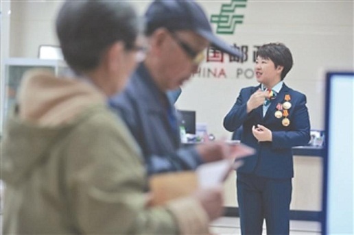 在自動存取款機前,排了十多位老人,樊潔先讓在后面排隊的老人到休息區(qū)的椅子上休息一下,再一個個幫助存取錢的老人辦理業(yè)務(wù)。有的老人聽不大清楚,她就湊近耳朵不厭其煩地一字一句地告訴他們,當(dāng)天上午,樊潔在自動存取款機前站著忙活了兩個多小時?!皩ξ覀儬I業(yè)廳的工作人員來說,要求來有迎聲,問有答聲,走有送聲,唱收唱付聲。只要用情用心服務(wù),就沒有辦不成的事。”她說這是東四郵局的傳統(tǒng)。