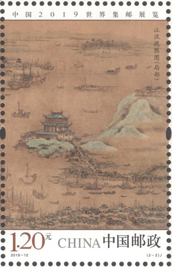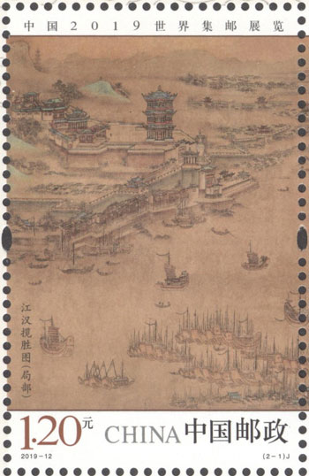 《江漢攬勝圖》是明代絹本國(guó)畫(huà),國(guó)家一級(jí)文物,現(xiàn)藏于武漢博物館。畫(huà)面中心內(nèi)容為長(zhǎng)江、漢水交匯及水上船只通行景象,漢陽(yáng)晴川閣與武昌黃鶴樓隔江相望。這幅畫(huà)集中表現(xiàn)了武漢最為重要的地理、人文風(fēng)貌,體現(xiàn)武漢悠久歷史文化的同時(shí),也飽含了世界郵展匯聚八方來(lái)客的喻義。