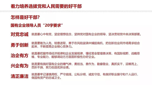 在全國國有企業(yè)黨的建設(shè)工作會議上,習(xí)近平總書記對國有企業(yè)領(lǐng)導(dǎo)人員提出了對黨忠誠、勇于創(chuàng)新、治企有方、興企有為、清正廉潔的“20字要求”。劉愛力在領(lǐng)學(xué)時表示,中國郵政將習(xí)近平總書記對國有企業(yè)領(lǐng)導(dǎo)人員的“20字要求”作為選拔干部、培養(yǎng)干部、考核干部的根本遵循,嚴格貫徹執(zhí)行《黨政領(lǐng)導(dǎo)干部選拔任用工作條例》,堅持好干部標(biāo)準(zhǔn),把政治標(biāo)準(zhǔn)放在第一位。