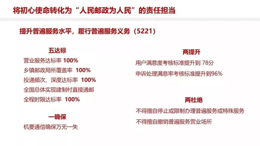 普遍服務(wù)是黨和國家賦予郵政企業(yè)的神圣使命,是法律性制度安排,是中國郵政的政治責(zé)任和政治擔(dān)當(dāng)。做好普遍服務(wù):是厚植黨的執(zhí)政基礎(chǔ)的需要,是貫徹以人民為中心的思想的需要,是體現(xiàn)企業(yè)自身責(zé)任的需要,是獲得國家支持、社會認可的需要,是獲得人民信賴、建立發(fā)展優(yōu)勢的需要,是協(xié)同發(fā)展、做優(yōu)做強做大中國郵政的需要。