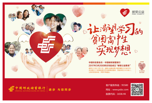 2017年,郵儲(chǔ)銀行向“郵愛公益基金”捐資500萬元,加上郵儲(chǔ)銀行員工和社會(huì)大眾的捐款,2017年“郵愛公益基金”累計(jì)募資1100多萬元。截至2018年末,“郵愛公益基金”已累計(jì)募資2000余萬元,幫助2400多名高中生實(shí)現(xiàn)成才夢(mèng)想。