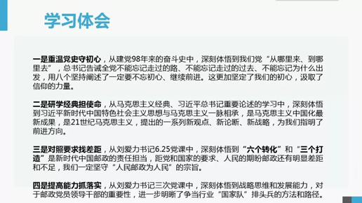 其他黨組成員分章節(jié)領(lǐng)學(xué)《選編》《綱要》和習(xí)近平總書記有關(guān)重要講話精神等重要內(nèi)容,并結(jié)合實(shí)際談體會(huì)。大家認(rèn)為,要不忘來時(shí)路,踐行新使命。以本次主題教育為契機(jī),扎實(shí)推進(jìn)郵政系統(tǒng)黨的政治建設(shè),深化形式主義、官僚主義集中整治,加強(qiáng)基層黨組織建設(shè),開展黨員領(lǐng)導(dǎo)干部綜合評(píng)估,持續(xù)深化巡視整改,聚焦改革發(fā)展的突出問題進(jìn)行整改,把主題教育成效轉(zhuǎn)化為攻堅(jiān)克難、干事創(chuàng)業(yè)的實(shí)際成果。
