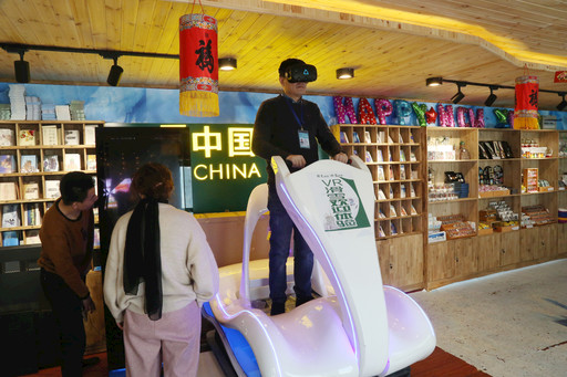 游客在冰雪大世界主題郵局體驗VR滑雪。