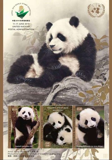 聯(lián)合國郵政發(fā)行了以“聯(lián)合國開發(fā)計劃署全球首對動物大使”成都大熊貓基地的雙胞胎“啟啟”和“點點”為主角的小全張(圖1)。
