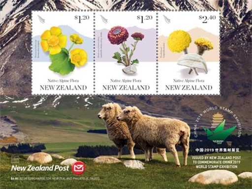 新西蘭于6月11日發(fā)行“中國2019世界集郵展覽”郵票小全張,郵票圖案為“新西蘭高山植物”,小全張邊飾以新西蘭風景配上新西蘭郵政標識和此次世界郵展標識(圖2)。
