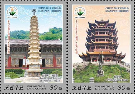 朝鮮為此次世界郵展發(fā)行郵票2種、郵資片1種,圖案選用兩國的古建筑——武漢黃鶴樓和平壤普賢寺古塔。朝鮮普賢寺建于1042年,13層古塔是普賢寺的鎮(zhèn)寺之寶,經(jīng)歷風雨滄桑,底座部分白石變成了褐色(圖3)。