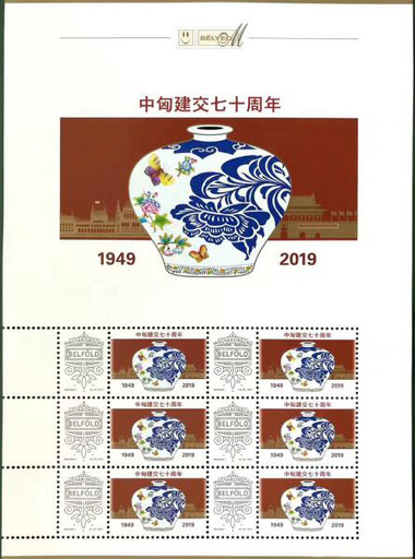 為慶祝中國與匈牙利建交70周年,匈牙利于5月23日發(fā)行了一套《中匈建交七十周年》紀念郵票(圖4),并在匈牙利國家行政大學內舉辦了發(fā)行儀式。該套郵票共有2枚,由來自中國的趙文潔和匈牙利的設計師瑪媞·阿萊克絲分別設計1枚,在兩枚郵票的背景當中都能看到中國天安門和匈牙利國會大廈的部分圖形元素。匈牙利設計師采用了中國的祥云作為主要圖案,并在紀念周年的數(shù)字中融入了匈牙利的傳統(tǒng)刺繡花紋。中國設計師表示瓷瓶代表著“平安與和平”,圓形瓶體則代表著“友好與圓滿”,并將中國牡丹以及匈牙利傳統(tǒng)花卉圖案與青花瓷瓶相結合,象征兩國政府和人民之間親切、緊密的友誼。