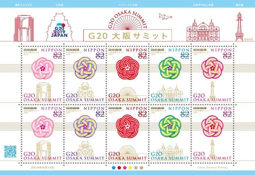 在第二季度中,最受全球關注的非在大阪舉行的二十國集團領導人峰會莫屬。日本為此發(fā)行了一套5枚郵票,圖案采用日本水引,為呼應主辦地大阪,郵票圖案的水引為梅花造型(圖5)。水引是日本儀式禮品上的繩結,代表結緣或是召喚幸福。郵票下方5個大阪地標,包括梅田藍天大廈、大阪城、大阪國際會展中心、大阪市中央公會堂、通天閣。此次峰會標志以富士山為設計主題,富士山的“山頂”和“朝日”象征著全球經(jīng)濟增長和繁榮。在富士山的下面,盛開的櫻花象征著春天的到來,也預示著全球經(jīng)濟的美好未來。