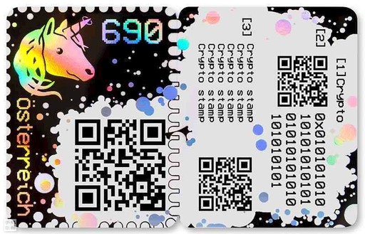 奧地利于6月11日發(fā)行世界首枚區(qū)塊鏈(加密貨幣)郵票(圖6)。該枚郵票不僅可以作為普通郵票使用,也可以與加密貨幣一樣作為數(shù)字資產儲存在數(shù)字錢包中永久收藏。郵票設計融合了郵票和自動化識別碼,左側包含獨角獸圖案和二維碼,右側包含以太坊區(qū)塊鏈錢包持有人訪問代碼和另一附加碼,可以通過以太坊錢包轉讓或轉移,每一次交易都會被永久記錄在區(qū)塊鏈中。