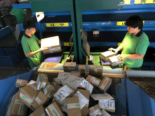 余杭集包處理中心的員工在用混合收寄一體機(jī)處理包裹?! 跬踅?nbsp; 攝