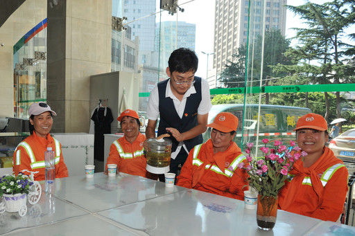自從五四廣場所有了“愛心驛站”,吳娟娟再也不擔心沒地兒休息、沒地兒吃飯了,她每天中午都會來到五四廣場所,用微波爐熱飯菜,吃完飯后再趴在桌子上休息一會兒,郵政員工會提前把水燒好,讓她喝上熱茶。“這是我專門給他們留的茶葉,只有我和他們知道藏茶葉的地點?!崩钣儡姶蛉さ?。