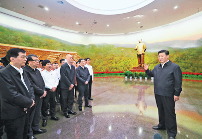 離開來青軒,習(xí)近平來到香山腳下的香山革命紀(jì)念館,參觀了《為新中國(guó)奠基——中共中央在北京香山》主題展覽。新建成的紀(jì)念館莊重大氣,“四梁八柱”的雨棚造型寓意黨中央在香山為新中國(guó)搭建四梁八柱。28根廊柱,象征中國(guó)共產(chǎn)黨從建黨到建立新中國(guó)28年的奮斗歷程。南廣場(chǎng)上矗立著高19.49米的國(guó)旗桿,寓意中華人民共和國(guó)誕生于1949年。主題展覽由“進(jìn)京‘趕考’”、“進(jìn)駐香山”、“繼續(xù)指揮解放全中國(guó)”、“新中國(guó)籌建”、“不忘初心、牢記使命、永遠(yuǎn)奮斗”5個(gè)部分組成,按歷史脈絡(luò),通過800多張圖片、報(bào)照、地圖、表格和1200多件實(shí)物、文獻(xiàn)和檔案,全景式生動(dòng)呈現(xiàn)中共中央在香山期間領(lǐng)導(dǎo)全國(guó)各族人民,完成民族獨(dú)立和人民解放的歷史使命、開啟中國(guó)歷史發(fā)展新紀(jì)元的光輝歷程。