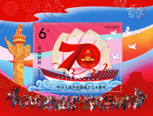 中國(guó)郵政定于2019年10月1日發(fā)行《中華人民共和國(guó)成立七十周年》紀(jì)念郵票1套5枚,小型張1枚。郵票圖案名稱分別為:經(jīng)濟(jì)持續(xù)健康發(fā)展、社會(huì)主義民主政治推進(jìn)、文化繁榮興盛、人民生活不斷改善、建設(shè)美麗中國(guó),小型張圖案名稱為:祝福祖國(guó)。全套郵票面值為12元。