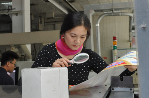 郵票設(shè)計(jì)者原藝珊查看郵票印制情況。陸航 攝