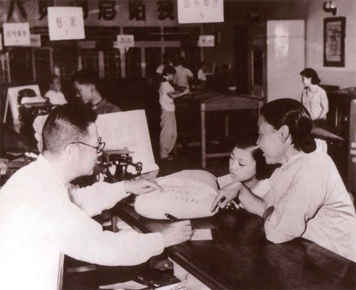 1958 年,東四郵局主動(dòng)改善服務(wù),資深營(yíng)業(yè)員于洪澤(左一),是在舊中華郵政工作過(guò)22 年的郵務(wù)佐,深信不能替用戶寫(xiě)字的老規(guī)矩沒(méi)有錯(cuò),經(jīng)過(guò)服務(wù)思想教育,他告別了以前的自己,主動(dòng)為用戶填寫(xiě)單式。