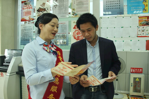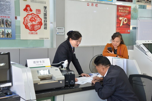 顧朝竹悉心為客戶辦理財產(chǎn)品購買登記手續(xù)。