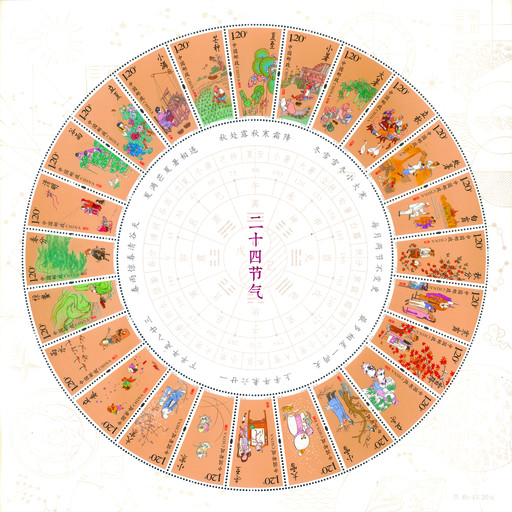 王虎鳴在小全張邊飾設計上使用了中國古代數(shù)學、天文學著作中的元素,包含日、月、星斗、算酬、古人描繪的天與地關系圖、紫微垣以及古星圖等。這些元素描繪了中國古人如何通過觀察自然來確定二十四節(jié)氣,從事農(nóng)業(yè)生產(chǎn)和生活。郵票中心的圓中將太極、地支、黃道度數(shù)與二十四節(jié)氣的對應關系進行了展現(xiàn),進一步闡明了中國傳統(tǒng)文化的博大精深和相互聯(lián)系,也表達了中華民族一直以來注重人與自然的關系,講究天人合一的思想。