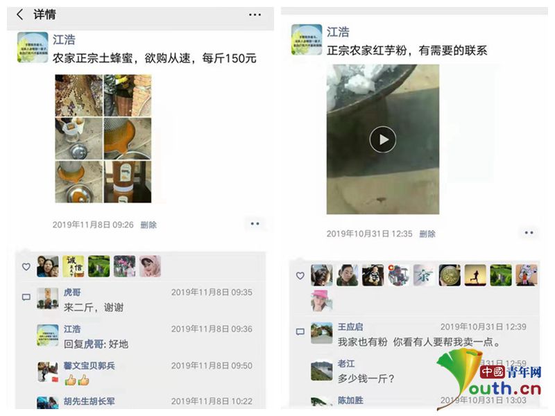 全縣23個鄉(xiāng)鎮(zhèn)的土豬、土雞、蜂蜜、葛根粉、干菜等土特產(chǎn)在他的朋友圈“輪番出售”。“農(nóng)家正宗土蜂蜜,預購從速,每斤150元?!苯衲辍半p11”之前,江浩在朋友圈“賣貨”,不一會兒便有買家留言,“來二斤,謝謝!”