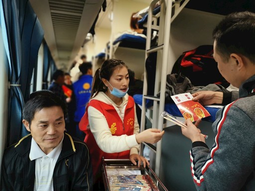 郵政志愿者在火車上為老鄉(xiāng)們服務。