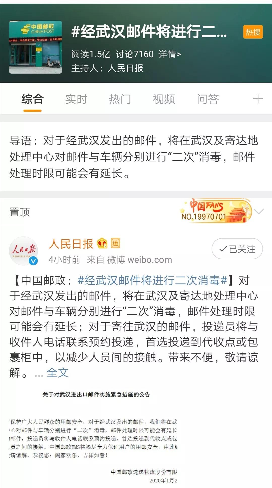 為保障用戶用郵安全,經(jīng)武漢發(fā)出的郵件,中國郵政在武漢及寄達地處理中心對郵件與車輛分別進行二次消毒。