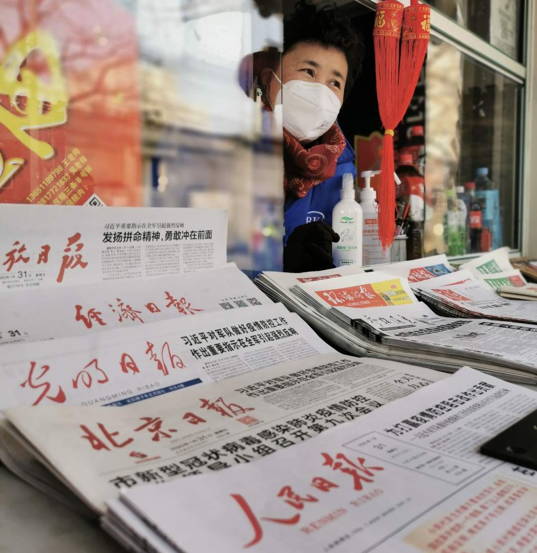 這個(gè)春節(jié)與往年不同,她開門第一件事兒,就是做好報(bào)刊亭的清潔消毒和自己的防護(hù)工作。她說,北京市報(bào)刊零售公司為我們配發(fā)了免洗消毒液和消毒劑,每天詢問健康情況,叮囑我們注意防護(hù)。9:30,一位老大姐過來買《北京日?qǐng)?bào)》和《參考消息》;還有人來打聽晚報(bào)和疫情情況;9:40,一個(gè)快遞小哥兒習(xí)慣地把車停在報(bào)刊亭旁邊,掃碼4塊錢買了《北京日?qǐng)?bào)》《參考消息》《環(huán)球時(shí)報(bào)》,直說好幾天沒看報(bào)了。今年從除夕到初七,這個(gè)報(bào)刊亭銷售報(bào)刊1599元,《人民日?qǐng)?bào)》《北京日?qǐng)?bào)》《參考消息》《北京晚報(bào)》累計(jì)銷售近500份。大姐這些天雖然總是戴著口罩,可一見到老客戶,眼角笑容立馬蕩漾出來,郵局配發(fā)的消毒液,她就擺在柜臺(tái)前面,經(jīng)常招呼顧客們消毒使用。問她怎么不關(guān)門休息幾天???她笑笑說,“周邊老人需要我啊,他們說報(bào)刊亭可不能再關(guān)了門了,每天就想著到報(bào)刊亭來溜達(dá)一圈呢”。