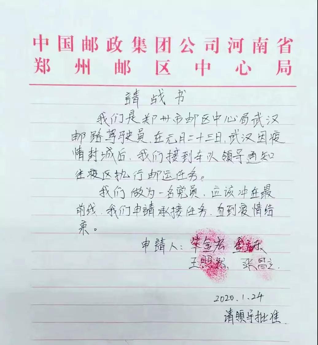 “這是1月23日武漢封城后,我第4次執(zhí)行往武漢運(yùn)送醫(yī)療物資的任務(wù)。因?yàn)閺幕貋?lái)后都要接受隔離觀察,吃住在單位,可能長(zhǎng)時(shí)間都回不了家。為了大家的生命安全和身體健康,面對(duì)這項(xiàng)特殊的任務(wù),我和王照然、朱金宏、金玉東等武漢郵路的黨員們一起向運(yùn)輸中心黨支部遞交了請(qǐng)戰(zhàn)書(shū),自愿承擔(dān)武漢郵運(yùn)任務(wù),直至疫情結(jié)束。從大年初一到現(xiàn)在,我已經(jīng)一個(gè)星期沒(méi)有回家了,但是作為一名共產(chǎn)黨員,也是一名退伍老兵,我認(rèn)為這是我應(yīng)該做的?!?張昌立說(shuō)。