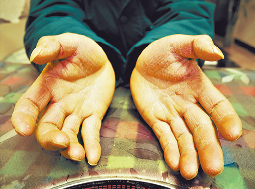 總幫客戶拆快遞包裝,加上天氣多風(fēng)、投遞量大,貴州省都勻市郵政分公司攬投員彭光徳雙手干裂發(fā)黃。 聶悠瑞 攝
