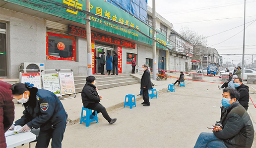 山東菏澤郵政農(nóng)村支局在營業(yè)廳外設(shè)立等待專區(qū),客戶測量體溫并消毒后方可進(jìn)入廳堂辦理業(yè)務(wù)。 李慶昌 提供
