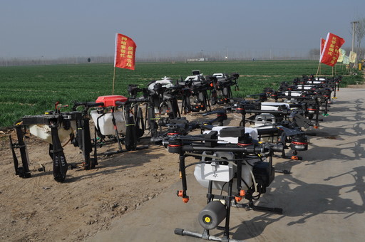 飛防作業(yè)前,11架無(wú)人機(jī)整齊排開(kāi),場(chǎng)面甚是壯觀。