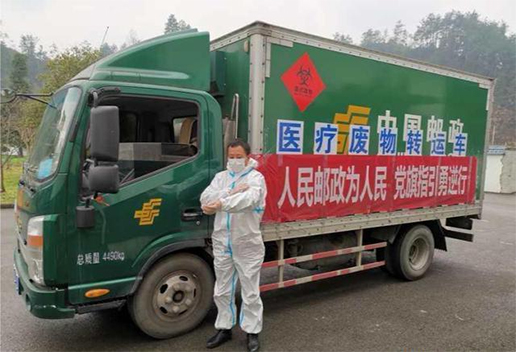 得知消息后,州郵政公司員工、退役軍人尹江、向耀俊、江道權(quán)做通家屬工作,主動(dòng)要求參與轉(zhuǎn)運(yùn)工作,火線組建突擊隊(duì),駕郵車(chē)出征高危戰(zhàn)場(chǎng),為定點(diǎn)收治醫(yī)院轉(zhuǎn)運(yùn)醫(yī)療廢棄物。