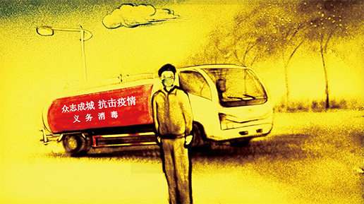 記者又問(wèn)陳娜,知道他給消毒車隊(duì)捐了20桶消毒液?jiǎn)??陳娜搖搖頭說(shuō),他不講,但是我支持他。于是,她用自己的一技之長(zhǎng)為他畫了一幅沙畫,名字就叫《消毒送安全 郵件送希望》。