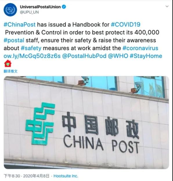 4月9日,萬國郵政聯(lián)盟在其官方社交媒體上發(fā)布了由中國郵政集團有限公司制作的《新冠病毒防護指導手冊》英文版,向世界分享中國郵政的疫情防控經驗。