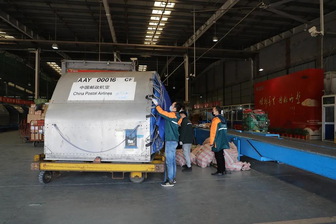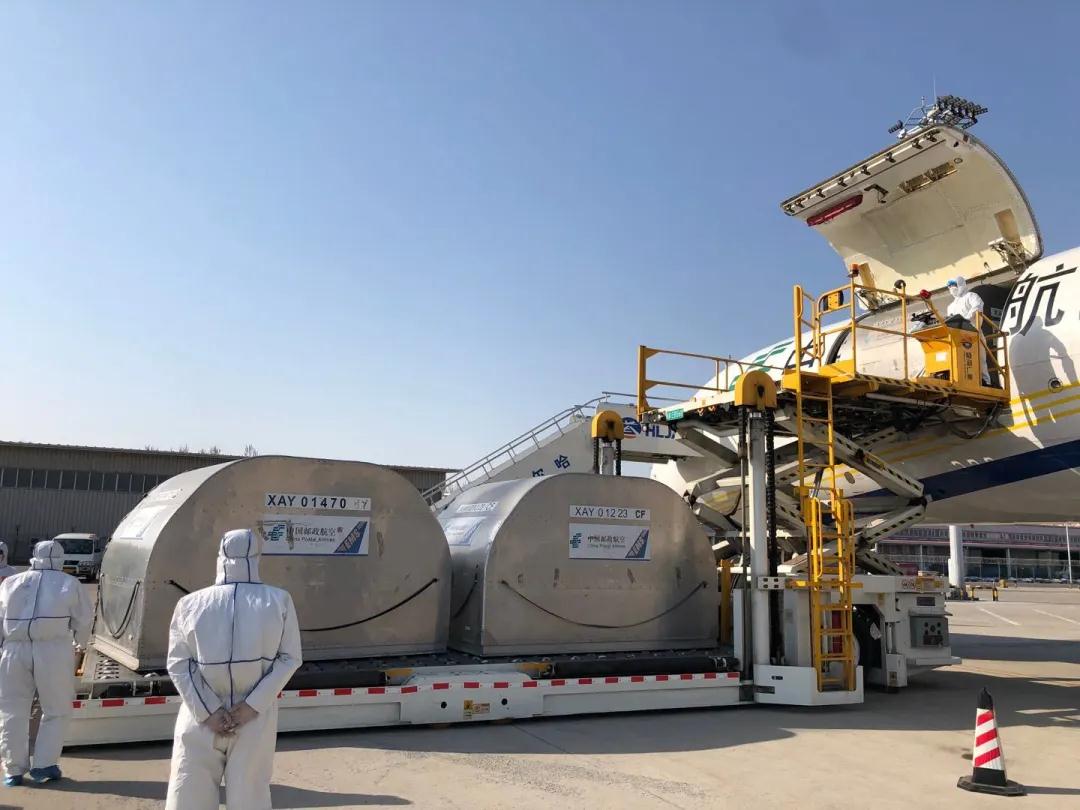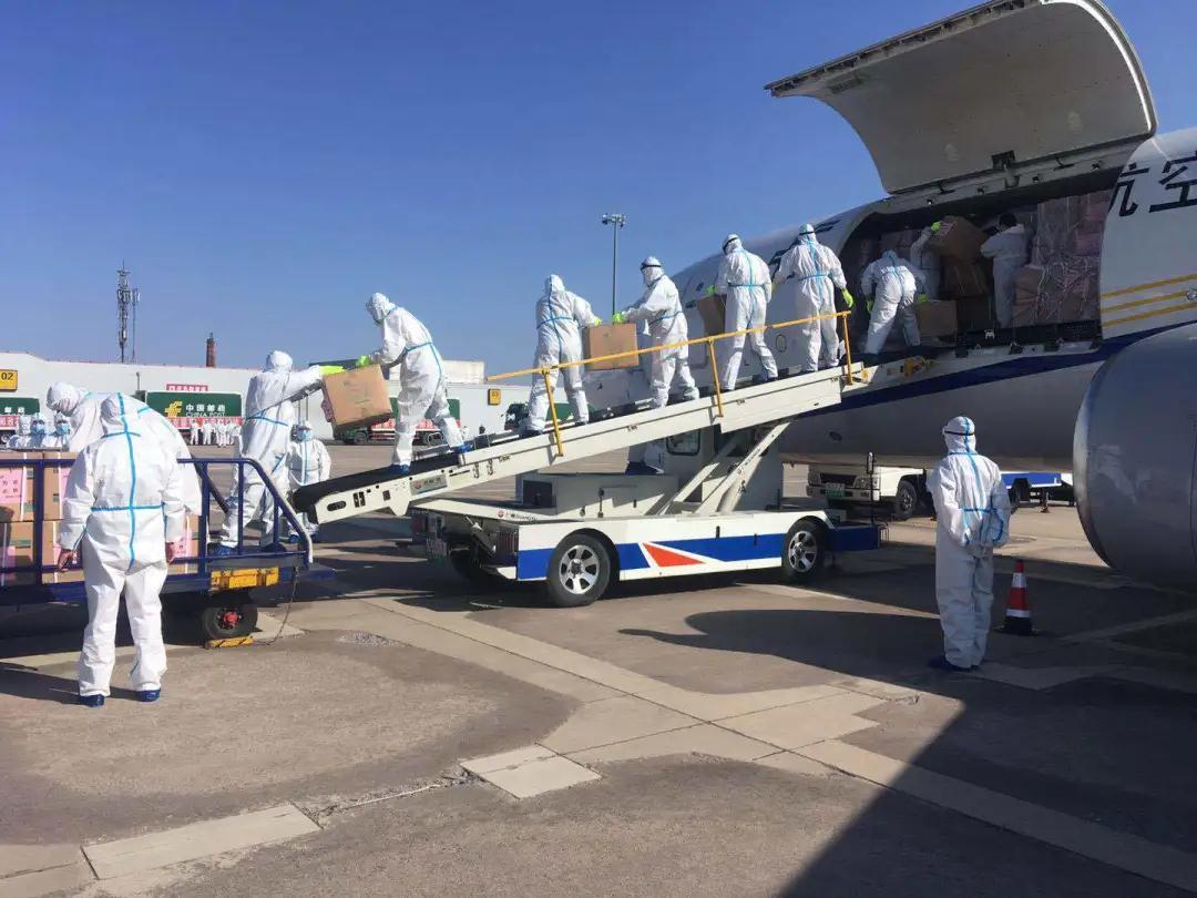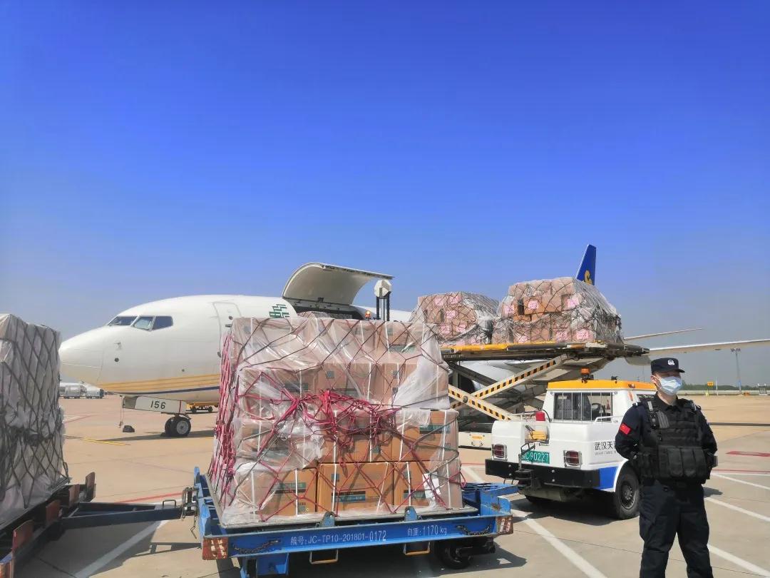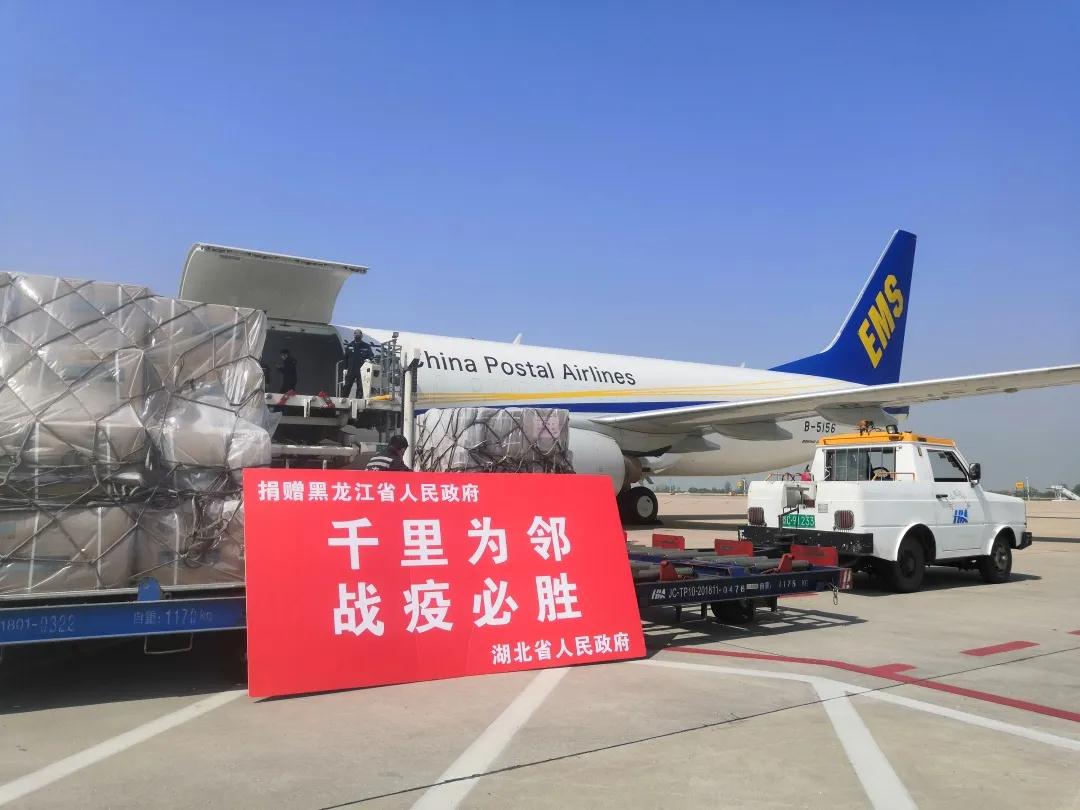 湖北省捐贈(zèng)物資裝上郵航包機(jī)。