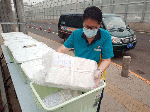 今年全國兩會期間,按照兩會總務組提出的“全封閉、無接觸”原則,北京郵政采取“定點無接觸式投遞”方式配送報刊、信件等郵件,并使用專用箱對兩會郵件進行統(tǒng)一消毒,確保兩會郵政服務與疫情防控工作萬無一失。圖為北京郵政工作人員在代表、委員駐地外對兩會用報進行核對(核對無誤后由代表、委員駐地相關工作人員接收)?! 跤浾?nbsp; 楊光 攝影報道