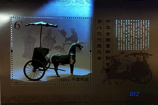 印制后的郵票,不僅在日光下色彩沉穩(wěn)大氣,文物木軺車和馬匹歷經歲月洗禮的滄桑盡顯,精準還原軺車車型,引發(fā)觀者對2000多年前郵運工具的無盡聯(lián)想,而且在熒光燈照射下,更加出彩,只見票面上忽有一束光柱自上而下,灑在木軺車上,車身、馬背在燈光籠罩下泛出光芒,車身、馬身下陰影、光圈斑駁相映,背景的漢代古畫忽然與車馬拉開了距離,似一幅壁畫靜立其后,木軺車瞬間從平面變?yōu)榱Ⅲw,讓觀者仿佛置身于博物館,在射燈光柱下觀賞真實文物。