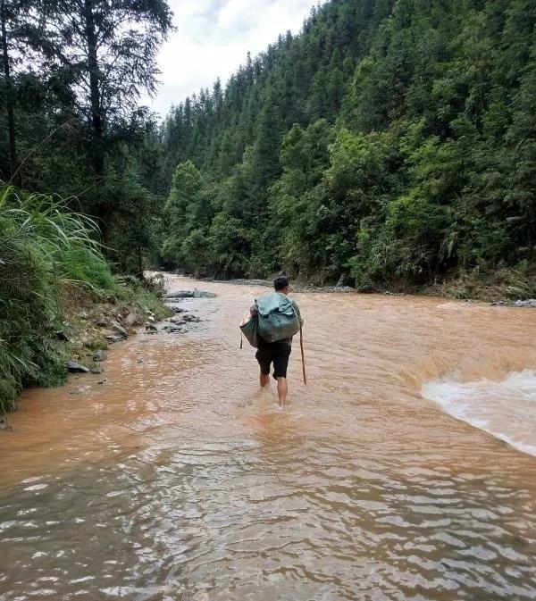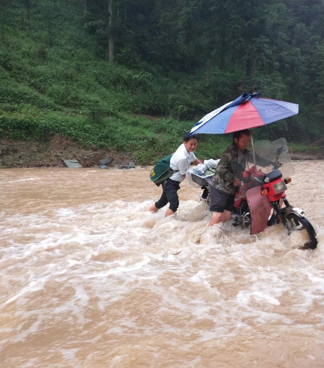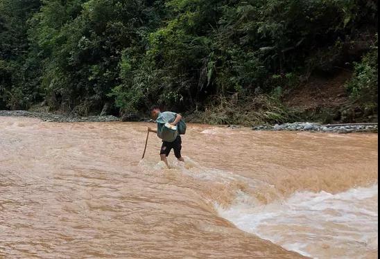 6月11日一早,潘志貴整理好郵件后出發(fā)了。當(dāng)他來(lái)到距離友娘村5公里的小河邊時(shí),被洪水擋住了前進(jìn)的道路,由于水勢(shì)過(guò)大,車(chē)輛沒(méi)法通過(guò),于是他停下摩托車(chē),到附近山上找來(lái)一根木棍,把郵包挎在自己的肩膀上,一邊手撐木棍一邊在河中試探著移步,之后繼續(xù)徒步走向友娘村。