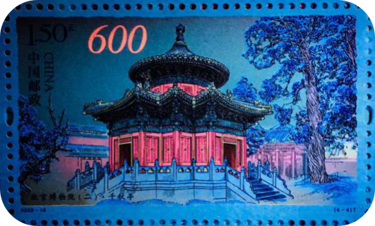 郵票采用黑、藍、紅、黃、金、無色紅熒光六色膠印。設(shè)計師和工藝團隊一道,經(jīng)過多次特種金油墨配制和上機試制,反復(fù)比較色彩效果,才最終選定油墨。另外,在郵票的左上方藏有無色紅熒光油墨印制的“600”字樣,在紫光燈下才會顯現(xiàn)出來。