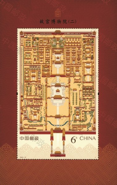 紫禁城建造技藝高超,內(nèi)在考究精妙,外在磅礴大氣,代表著當(dāng)時最高的建造水平。中央軸線上分布著三大殿(太和殿、中和殿以及保和殿)和后三宮(乾清宮、交泰殿以及坤寧宮),左右兩條次軸線上分別分布著慈壽宮、寧壽宮等宮殿。出于防御需要,宮殿建筑外圍筑有宮墻,四周分布有角樓,外有護城河環(huán)繞。故宮平面示意圖首次登上郵票,細膩、完整地呈現(xiàn)了故宮恢弘的建筑布局。