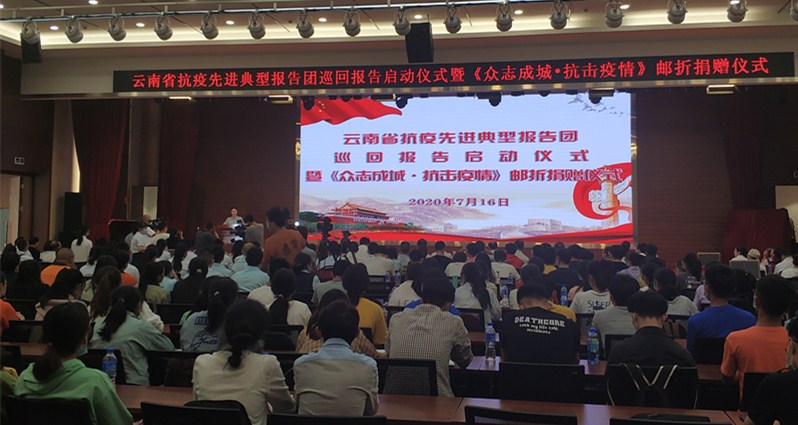 2020年7月16日,云南省抗疫先進(jìn)典型報(bào)告團(tuán)巡回報(bào)告啟動儀式暨《眾志成城抗擊疫情》郵折捐贈儀式在昆明醫(yī)科大學(xué)第二附屬醫(yī)院舉行。