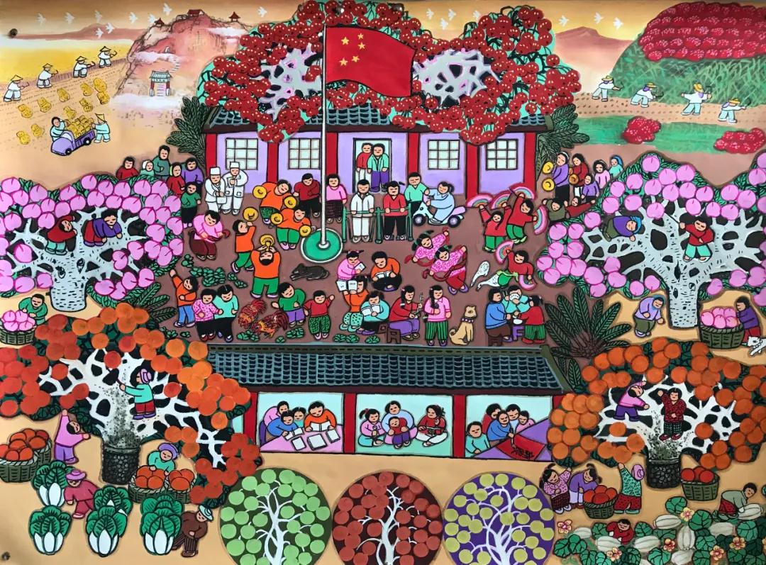 習近平總書記指出:“中國實現(xiàn)了快速發(fā)展和大規(guī)模減貧同步,貧困人口共享改革發(fā)展成果,這是一個了不起的人間奇跡?!碑敶袊跁鴮憽叭祟悮v史上最成功的脫貧故事”,全面小康的光明前景就在前方,“到處都是活躍的創(chuàng)造,到處都是日新月異的進步”,中國大踏步前行的信心從來沒有如此充足飽滿,中國人民的精神從來沒有如此昂揚煥發(fā),這些都為農(nóng)民畫創(chuàng)作者放歌新時代、描繪新時代提供了充沛自信和豐富靈感。而農(nóng)民畫活力迸發(fā)、各地農(nóng)民畫鄉(xiāng)不斷涌現(xiàn),正是中國經(jīng)濟繁榮發(fā)展、社會安定有序、人民安居樂業(yè)的生動注腳。