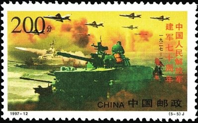 1997年8月1日,中國郵政發(fā)行了1997-12《中國人民解放軍建軍七十周年》紀念郵票1套5枚,票名分別是“陸軍”“海軍”“空軍”“戰(zhàn)略導彈部隊”和“陸??章摵涎萘暋?枚郵票,以陸、海、空和戰(zhàn)略導彈部隊的主戰(zhàn)兵器為主圖,背景是按兵種按時間有機串聯在一條主線上的建軍七十年來的重大事件,淡彩的背景與重彩的主圖珠聯璧合,能夠讓人自然重溫人民解放軍七十年的成長歷程,真切感受人民軍隊的現代化步伐。每幅畫面雖沒有出現一個軍人形象,但那隆隆開進的坦克、劈波斬浪的軍艦、呼嘯而過的戰(zhàn)機和騰空而起的導彈,創(chuàng)造了一種千軍萬馬奔騰向前的氣勢,表現出現代化戰(zhàn)爭操縱著現代武器與敵人決戰(zhàn)千里之外的新特點,收到了此處無人勝有人的藝術效果。