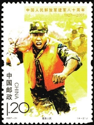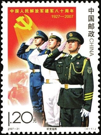 2007年8月1日發(fā)行2007-21《中國人民解放軍建軍八十周年》紀念郵票1套4枚,畫面生動表現了中國人民解放軍在黨的領導下,發(fā)揚聽黨指揮、服務人民、英勇善戰(zhàn)的優(yōu)良傳統(tǒng),刻苦訓練、抗洪搶險,參與聯合國維和行動,用忠誠和熱血捍衛(wèi)國家主權和安全,筑起共和國的鋼鐵長城,集中反映出軍隊建設的新成就和我軍忠實履行歷史使命的時代風采。